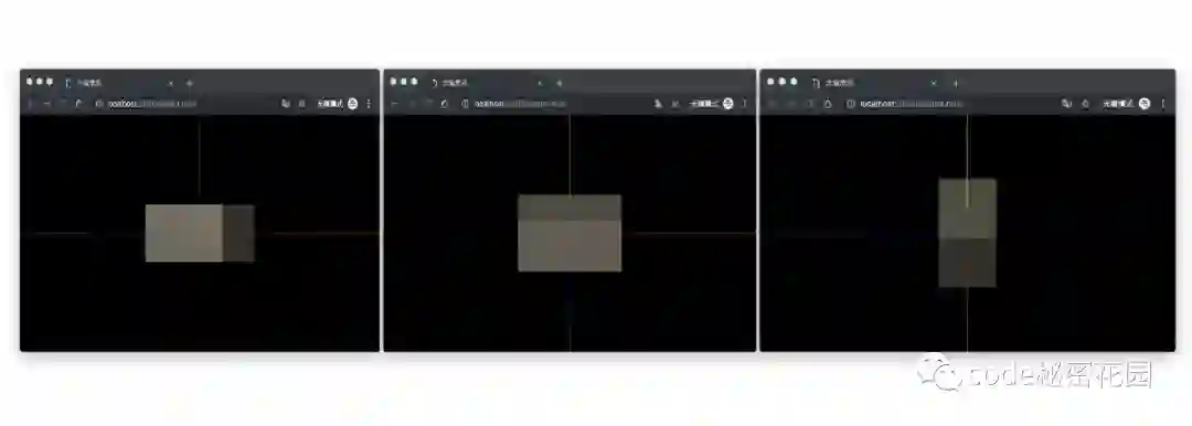 下面,我们让相机观察的方向指向原点,另外分别让 x、y、z为0,另外两个参数不为0,看一下视野会发生什么变化: