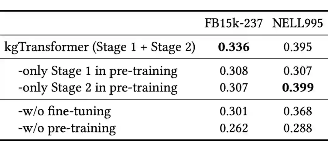 作者发现,pre-training 与 fine-tuning 作为模型的训练过程都是十分重要的,不管缺少哪一个部分,都会带来非常大的效果下降。而对于 pre-training 过程中的两个阶段,其中第二个阶段对于 FB15k-237 几乎没有影响,而给 NELL995 带来了显著的提升。考虑到 sparse refinement 的提出动机,说明 NELL995 中的稀疏 pattern 更多。