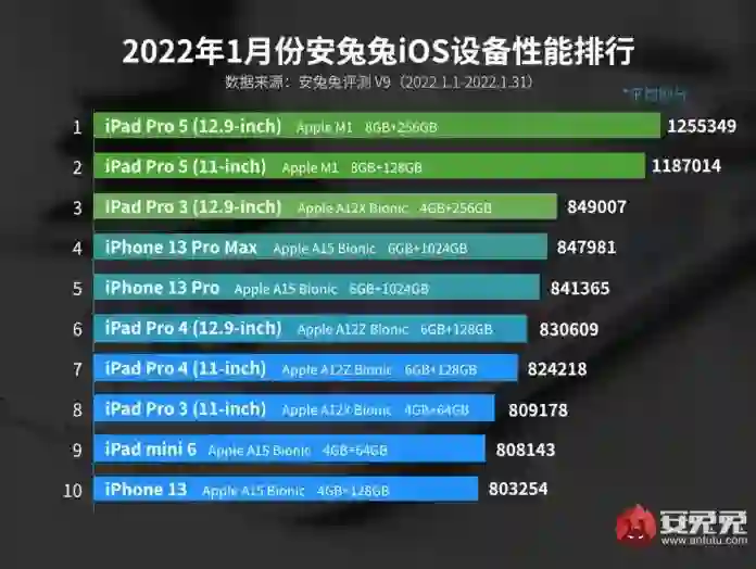 近日,跑分平台安兔兔发布了1月份iOS设备的性能排行榜。与去年12月相比,排名基本保持不变。 下面显示的数据是在1月1日至1月31日期间收集的,列出了设备的平均运行分数,而不是其最高运行分数。 和上个月一样,配备M1芯片的iPad Pro(12.9英寸)以1255349分的平均得分保住了第一名的位置。紧随其后的是11英寸的iPad Pro,得分为1187014分,位居第二。运行A12X仿生芯片的2018年iPad Pro第三代,仍然以1187014分位居第三。iPhone 13 Pro Max正在慢慢接近进入前三名,以847981分位居第四。紧随其后的六款苹果设备分别是iPhone 13 Pro,得分841365,iPad Pro 4(12.9英寸)得分830609,iPad Pro 4(11英寸)得分824218分,iPad Pro 3(11英寸)得分809178分,iPad mini 6得分808143分,iPhone 13得分803254分。 与12月份的排名相比,除了iPad Pro第三代(11英寸)和iPad mini 6互换了第8和第9位外,没有什么大的变化。
