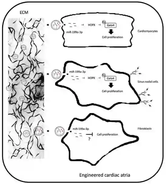 miR-199a-3p在工程化心房中的作用工作模式图。与新生心肌细胞和工程化心房中的窦淋巴结细胞相比,心脏成纤维细胞具有高增殖率的倾向。然而,通过抑制HOPX蛋白表达,心房ECM衍生的miR-199a-3p可以通过Gata4乙酰化的机制优先加速新生心肌细胞和窦淋巴结细胞而不是成纤维细胞的增殖,从而改善工程心房中心肌细胞的电活动和生长。