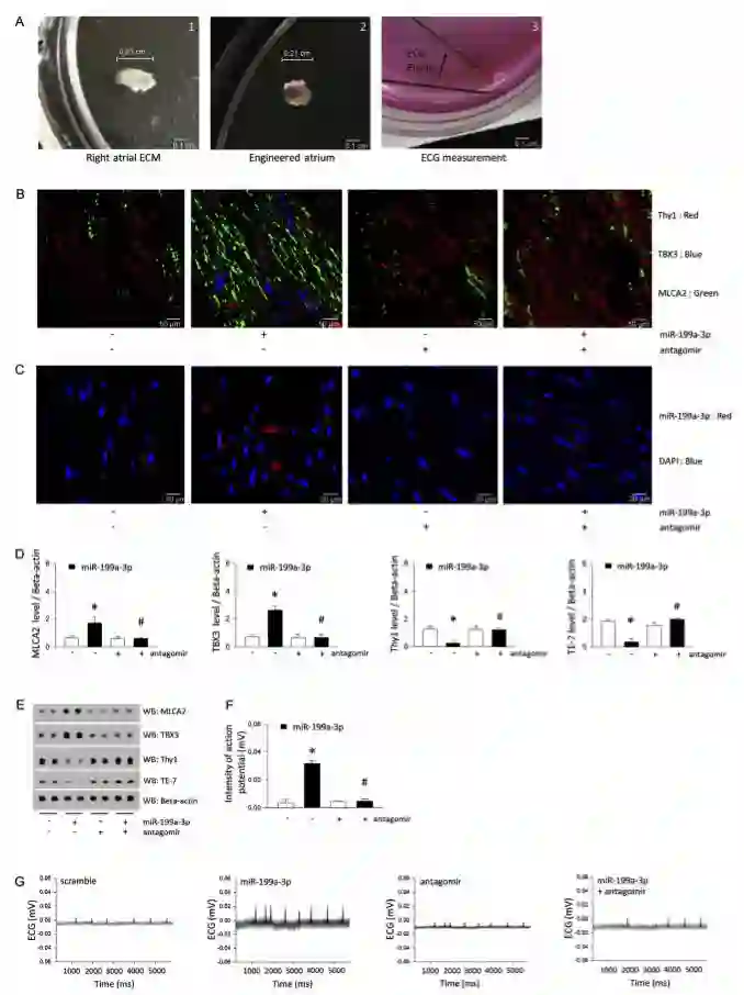 细胞外基质(ECM)在为心脏组织的适当再生提供必要的微环境中起关键作用。然而,导致ECM介导的心脏再生的具体机制尚不清楚。为了阐明潜在的机制,研究人员使用电子显微镜研究了心脏ECM的超微结构。有趣的是,从脱细胞右心房观察到大量微囊泡。RNA和蛋白质分析显示这些微囊泡含有外泌体蛋白和miRNA,研究人员将其称为ECM衍生的细胞外囊泡(ECM-EVs)。来自ECM-EVs的特异性miRNA miR-199a-3p通过抑制同源域纯蛋白(HOPX)表达和增加GATA结合蛋白4(Gata4)乙酰化促进分离的新生心肌细胞和窦淋巴结细胞的细胞生长。为了确定机制,研究人员敲除了Gata4,并证明了miR-199a-3p的作用需要Gata4作用于分离的新生心肌细胞和窦淋巴结细胞中的细胞增殖。为了进一步探索这种miRNA的作用,分离出新生心脏细胞,并将其种到心房ECM中,这里称为工程化心房。miR-199a-3p介导心肌细胞和窦淋巴结细胞群的富集,并且改善了工程化心房中窦淋巴结细胞的心电图信号活性。重要的是,miR-199a-3p的antagomir能够消除工程心房中miR-199a-3p的这些作用。进一步研究显示Ang II输注的窦性淋巴结功能障碍动物模型中,miR-199-3p处理的心脏细胞显著改善并恢复了电活动。总之,这些结果提供了ECM关键作用的明确证据,不仅提供了心脏组织生长的支架,而且通过ECM衍生的miR-199a-3p促进心房电生理功能。