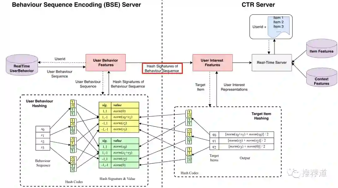 但是重新走target attention的老路,让target item与每个historical item逐一点积,前面已经说有了,性能上吃不消,那是死路一条。我们只能另辟蹊径,这时SimHash给我们指明了一条新路。