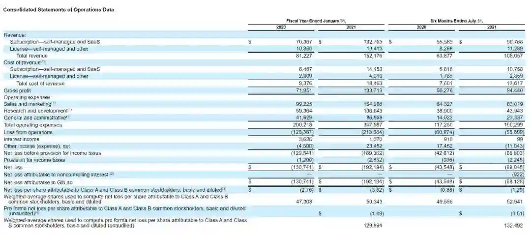 根据最新的文件,GitLab 在今年 2 月 1 日至 7 月 31 日期间半年收入 1.08 亿美元,净亏损 6900 万美元,相比之下,去年的同期的收入为 6400 万美元,亏损 4400 万美元。