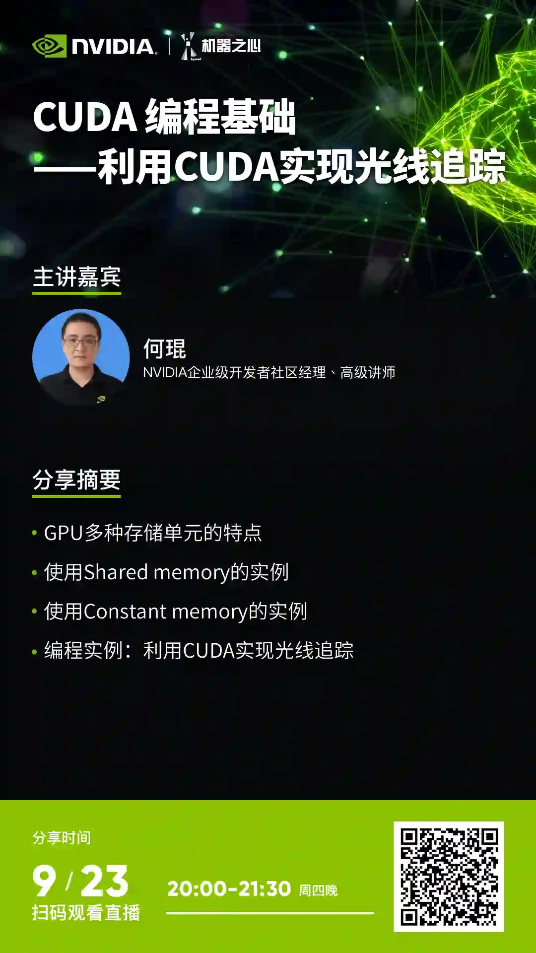 9月23日20:00-21:30,CUDA编程基础系列分享第二期:利用CUDA实现光线追踪。本次分享主要介绍GPU多种存储单元的特点、使用Shared memory的实例、使用Constant memory的实例、编程实例—利用CUDA实现光线追踪等内容。