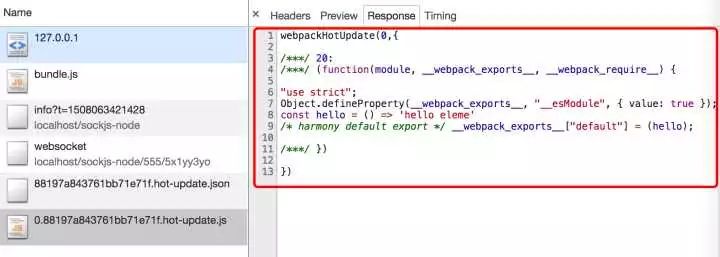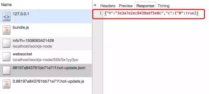 如上两图所示,值得注意的是,两次请求的都是使用上一次的 hash 值拼接的请求文件名,hotDownloadManifest 方法返回的是最新的 hash 值,hotDownloadUpdateChunk 方法返回的就是最新 hash 值对应的代码块。然后将新的代码块返回给 HMR runtime,进行模块热更新。