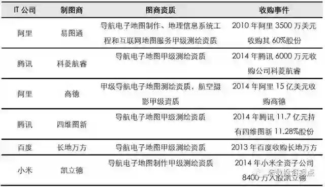 目前国内有 14 家地图具有导航地图甲级资质,四维图新、高德、易图通瓜分车载导航的前装市场,一共占据 98% 的市场份额。凯立德以 70% 的市场占有率在后装市场一枝独秀占据,目前这些公司或已经被互联网巨头所收购,或被其入股。