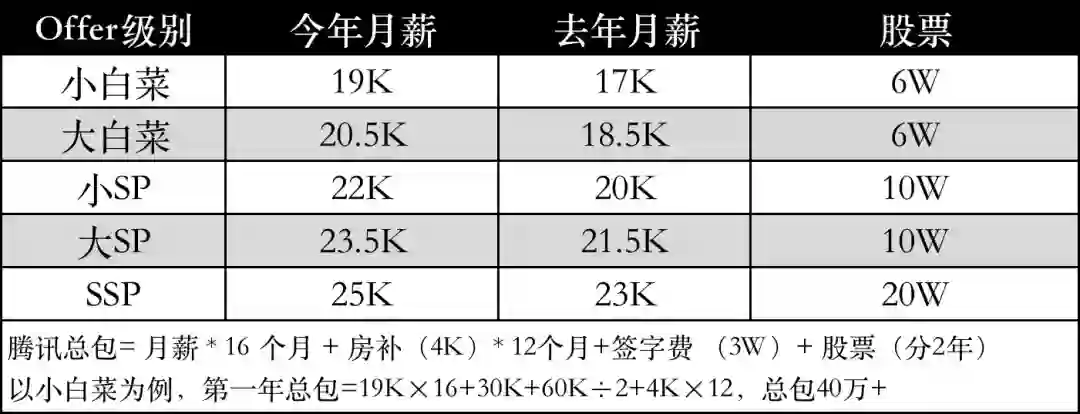 就拿腾讯今年校招薪酬来说,小白菜第一年总包40W+,我在网上找了个校招产品运营岗位分析了一下,月薪17K,拿16个月,房补4K,一次性签字费3W,股票,总包38W!