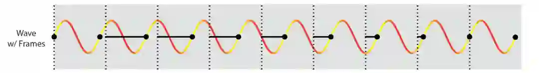 红色-黄色曲线是一个周期信号。为了便于观察,每个周期的开始处都标记了一个黑点。黑色虚线代表帧与帧之间的切割线。如果我们沿用旧方法,将信号切分成周期帧来对其建模,就像 GAN 中的上采样卷积和短时傅立叶变换 (STFT) 一样,则每帧的起点(黑色虚线)与波的起点(黑点)之间的距离不会是定值,而会随时间变化(黑色实线)。