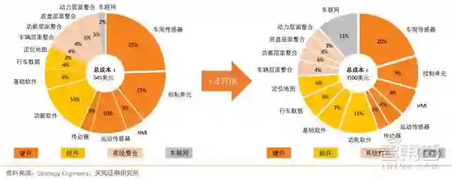 3、L4 相对比 L1、L2,单车系统零部件支出会增长 470%,从 545 美元升至 3100 美元/车。