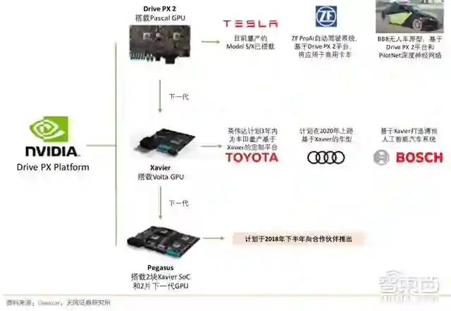 英伟达在硬件层面算力和研发节奏上成为当仁不让的先行军:此前,公司的汽车业务主要集中在汽车显示屏和影音系统(Drive PX),今年1月的 CES 大会上发布无人驾驶的整体布局(从车载超级电脑平台以及人工智能驾驶系统, Xavier),10 月英伟达在德国慕尼黑的 GTC Europe 大会上,发布了面向完全自动驾驶 L5 级别的新一代 Drive PX 人工智能车载计算平台 Pegasus。英伟达智能汽车合作方有大众(优化城市交通)、奥迪(联合Mobileye、Delphi 等设计的全球首款搭载 L3 级自动驾驶的量产车,新一代A8)等。