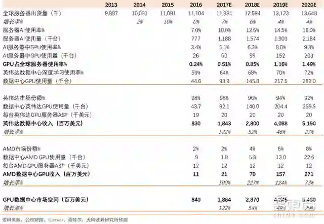 从市场容量/前景来看,云计算数据中心成为不可逆转的趋势,超级数据中心也越来越依赖GPU来更快地处理高要求的工作负载。目前,全球服务器中GPU的渗透率仅有 0.24%并基本被英伟达垄断,天风证券预计英伟达数据中心业务在2020年前将达40亿美元,对应全球服务器GPU 渗透率也将达 4 倍以上增长。