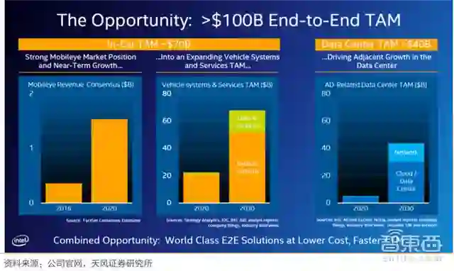 ▲英特尔给出的市场空间指引:汽车电子化和智能化整个市场空间,包括广告系统、数据和服务将从2020年的200亿美元提升到2030年的700亿美元。