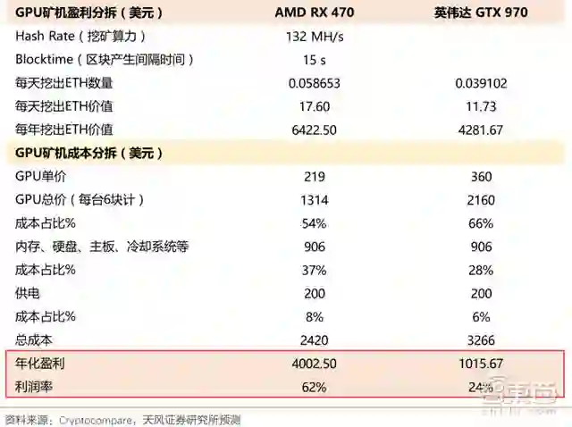 根据 cryptocompare 网站数据,AMD RX 470 GPU的矿机有明显优于英伟达 GTX 970 GPU 的经济回报,为了有效消弭挖矿和游戏需求冲突,并避免二手卡问题,英伟达针对虚拟数字货币挖矿热潮推出专门挖矿显卡(基于 GTX 1060 6GB 产品,完全取消显示输出接口,仅提供 90 天的质保);AMD 则发布了专门的挖矿驱动 Radeon Software Crimson ReLive Edition Beta for BlockchainCompute,为区块链计算工作负荷优化性能。