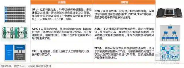 下游推理端更接近终端应用,更关注响应时间而不是吞吐率,需求更加细分,除了主流的GPU芯片之外,还包括CPU、FPGA( Xilinx、英特尔Altera、Lattice 及 Microsemi等)、ASIC (英特尔Nervana Engine、Wave Computing 的数据流处理单元、英伟达的DLA、谷歌 TPU、寒武纪 NPU等)也会在这个领域发挥各自的优势特点。