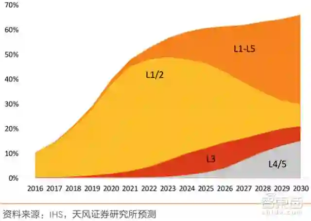 ▲全球自动驾驶 L1-L5 渗透率预测