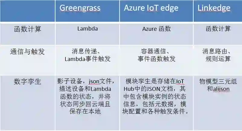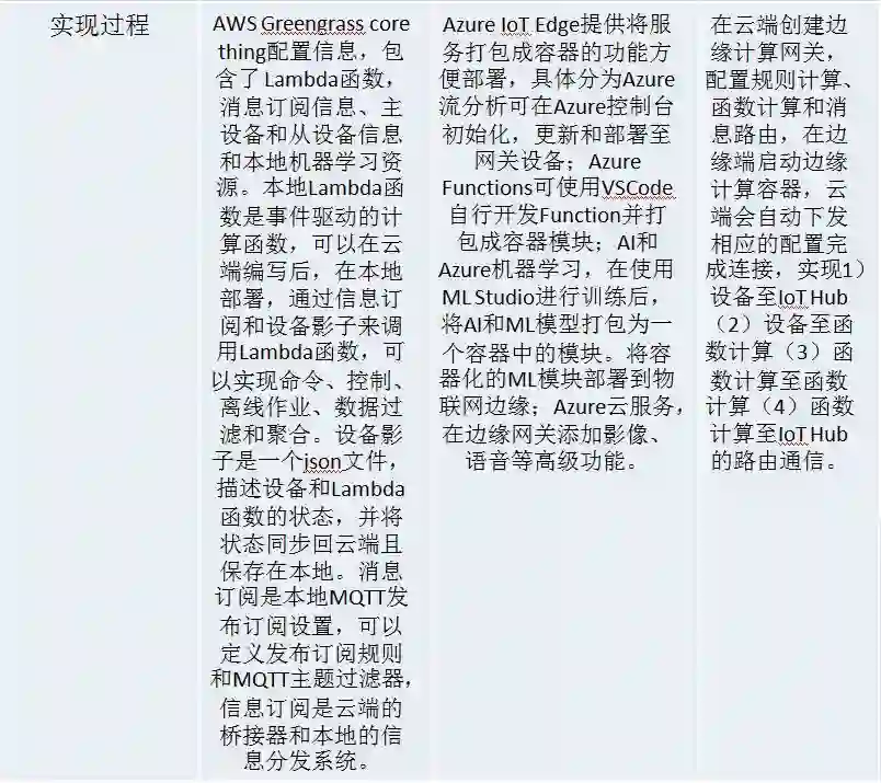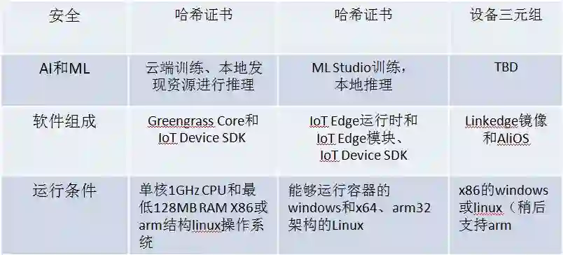 边缘计算是对于云计算的补充,边缘计算伴随着云服务而生,将云端的能力下降到边缘。通常边缘不需要处理所有数据,而是和云端协同,共同完成计算。所以所有的边缘计算实践都需要云端配置和边缘端部署。云计算厂商中AWS、微软和阿里云是边缘计算最早发力的。其中AWS推出了Greengrass,微软推出了Azure IoT edge,而阿里云则推出了linkedge等边缘计算工具。这些工具均实现了定义中所介绍的,将云端能力迁移到设备中,既可以在本地处理数据,又可以利用云端的优势。对这三家边缘计算平台的各方面作一比较:
