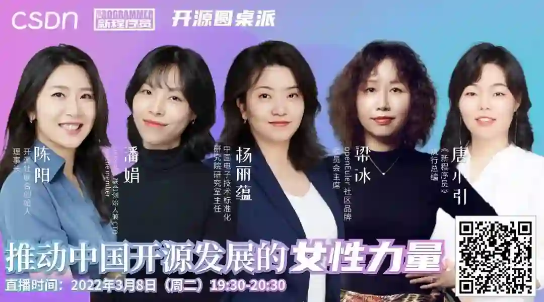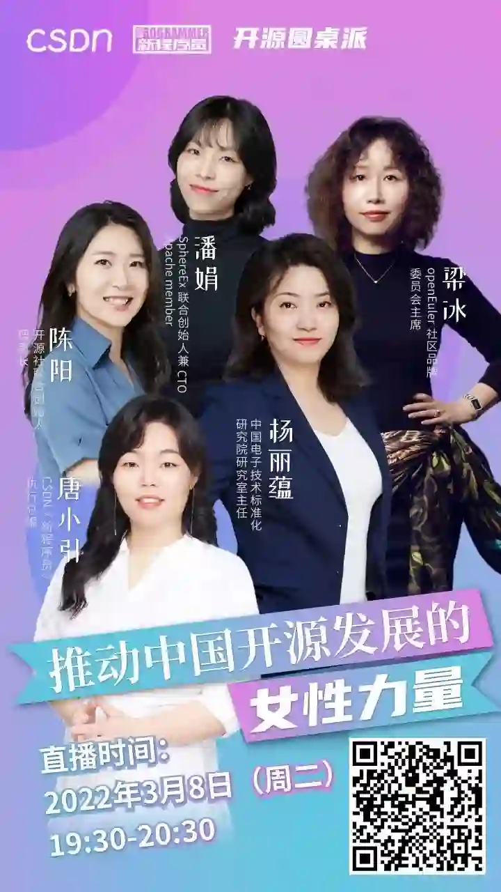带着以上疑惑,3月8日周二晚19:30,由CSDN重磅打造开源直播栏目《开源圆桌派》第二期“推动中国开源发展的女性力量”,有幸邀请到中国电子技术标准化研究院研究室主任杨丽蕴,SphereEx联合创始人&CTO潘娟,openEuler 开源社区品牌委员会主席梁冰,开源社联合创始人 、理事长陈阳(Emily)4位在开源的不同领域扮演着重要角色的开源女神,与大家共同探讨别具新意的女性开源话题,从另一个角度还原开源圈真实面貌,一起感受开源世界中的“lady power”!