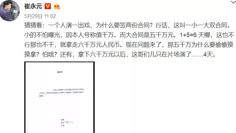 崔永元在5月末用“阴阳合同”四个字,制造了2015年股灾以来文娱上市公司在证券市场最惨淡的一天。