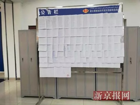 6月4日上午,霍尔果斯行政服务大厅中张贴的税务核查公告 (新京报记者 李云琦 摄)