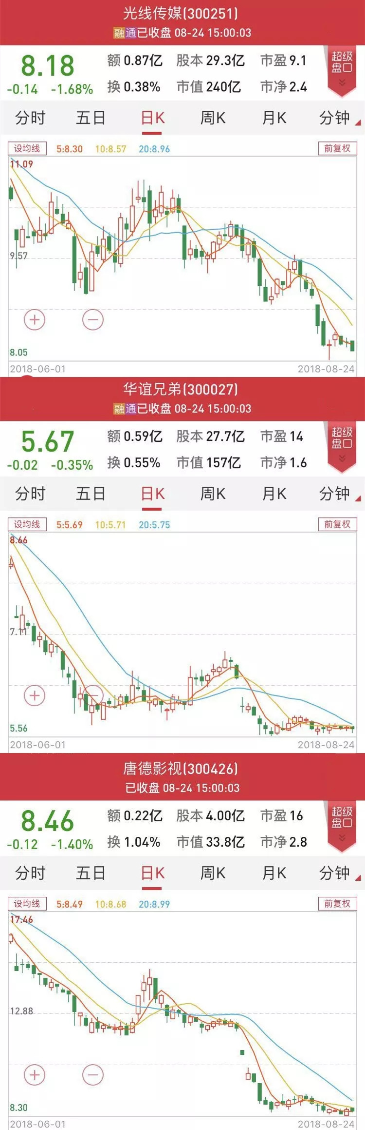 6月以来,光线传媒、华谊兄弟、唐德影视股价变化