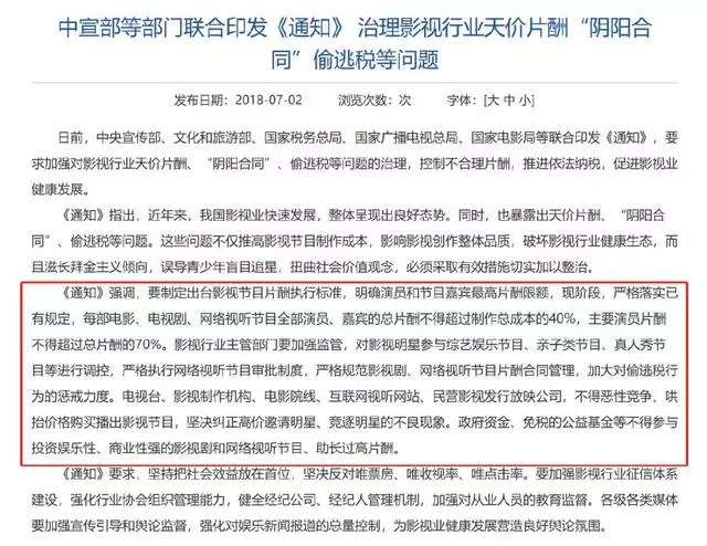 8月11日,优爱腾三大视频网站,联合华策影视、柠萌影业、慈文传媒、耀客传媒、新丽传媒六家制作公司发表了抵制“天价片酬”的声明,且明确指出,“片酬相应产生的税费由演员方承担”——此前,很多艺人在签订合约时都要求“税后收入”,由影视公司代替艺人缴纳个人所得税的现象业内已经十分普遍。