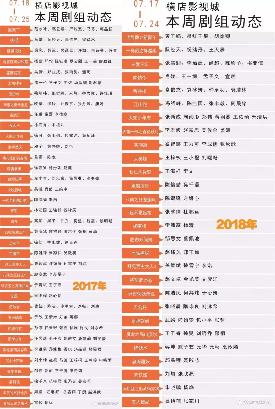 横店影城剧组演员咖位与剧组数量同期对比
