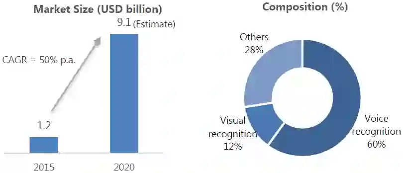 传统科技巨头百度、阿里巴巴和腾讯目前在人工智能领域处于领先地位。在它们之后,国内还有上百家创业公司正在人工智能的各个方向探索新技术。目前,语音和计算机视觉是国内人工智能市场最热门的两个方向,分别占据 60% 和 12%的市场(如下图)。另一方面,传统行业的公司也在积极引入人工智能,以降低自己的运营成本。艾瑞咨询在一份调查报告中表示:中国的人工智能市场将在 2020 年达到 91 亿美元的规模,这意味着在未来几年内,每年的增长速度都达到50%。