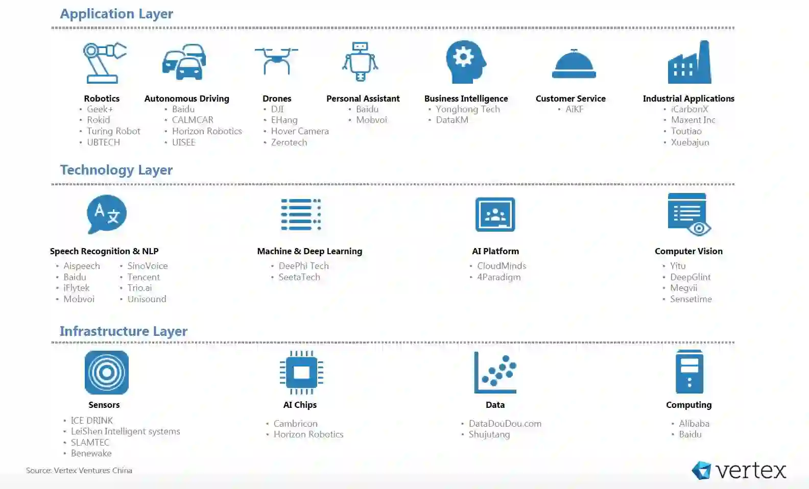 中国的人工智能生态系统包含大型互联网企业以及新兴的垂直公司。下面从应用层、技术层以及基础层三个方面进行分析。