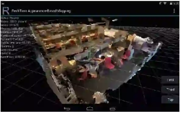 RTAB-MAP(Real Time Appearance-Based Mapping)是RGB-D SLAM中比较经典的一个方案。它实现了RGB-D SLAM中所有应该有的东西:基于特征的视觉里程计、基于词袋的回环检测、后端的位姿图优化,以及点云和三角网格地图。因此,RTAB-MAP给出了一套完整的(但有些庞大的)RGB-D SLAM方案。目前我们已经可以直接从ROS中获得其二进制程序,此外,在Google Project Tango上也可以获取其App使用(如图6所示)。