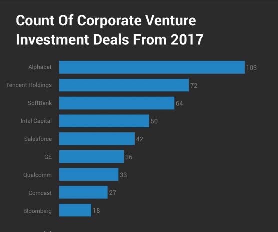 多年来,英特尔及旗下的风险投资公司英特尔资本(Intel Capital)一直是最活跃的企业风险投资者。但在2017年,Crunchbase的数据显示,Alphabet的主要风险基金超越了这家芯片制造商。腾讯控股及其风险投资子公司排名第二,拥有高达1000亿美元资本的软银在2017年共计宣布了64笔交易。