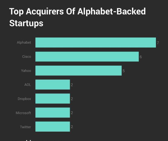 有很多企业收购的创业公司获得了Alphabet旗下一只或多只基金的投资。Crunchbase的数据显示,有81个实体收购了100家谷歌参与投资的公司。在其中,Alphabet似乎是它自己最好的客户,如下图所示: