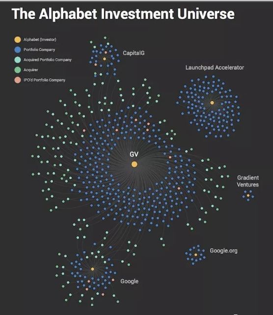上述显示了Alphabet旗下各投资部门与其各自投资组合之间的联系。这幅图描绘了谷歌6大投资集团(上图标记为黄色)、570个投资对象和75家收购了Alphabet支持的投资组合公司的企业之间的676个连接。