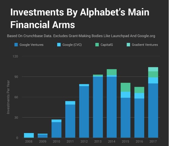 总体而言,Alphabet是最多产的创业公司企业投资者之一。Crunchbase数据显示,Alphabet的三大主要投资工具——GV(前身为Google Ventures)、CapitalG和Gradient Ventures——以及谷歌自己在2017年总共投资了103笔交易。