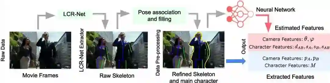 图2. 算法框架分为三个部分,(左)样例视频演员与相机信息估计,(中)样例视频相机行为分析,(右)新场景相机轨迹预测