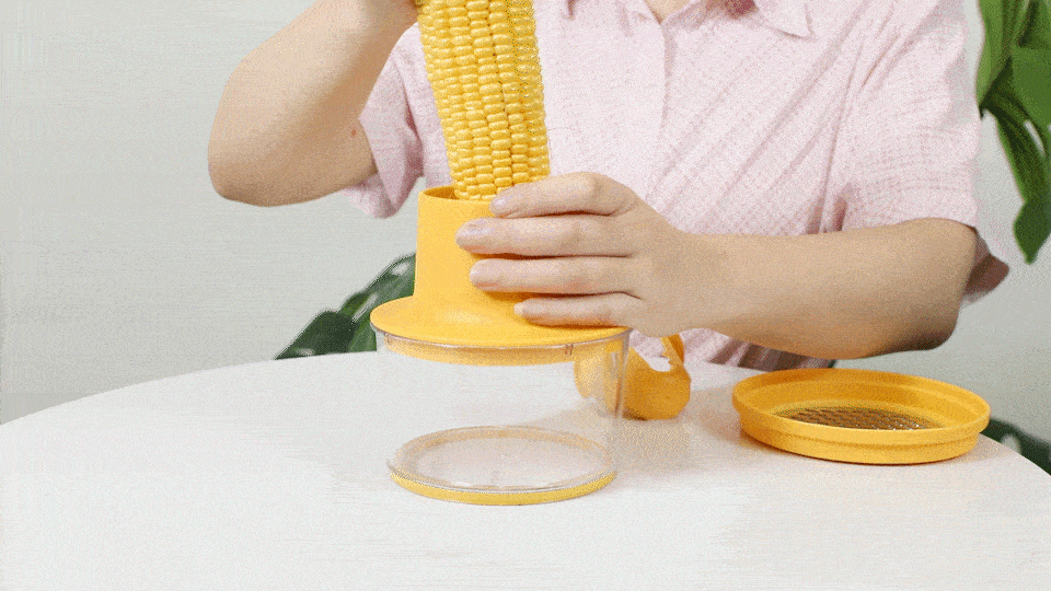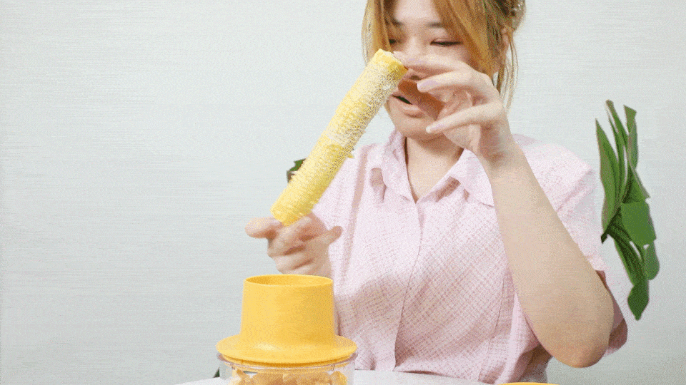 只需要把玉米往上一插,左三圈右三圈,扭扭玉米就能快速脱粒。整个过程毫不费力而且非常丝滑,没有发生玉米棒卡住转不动的尴尬事件,用户体验非常舒爽。
