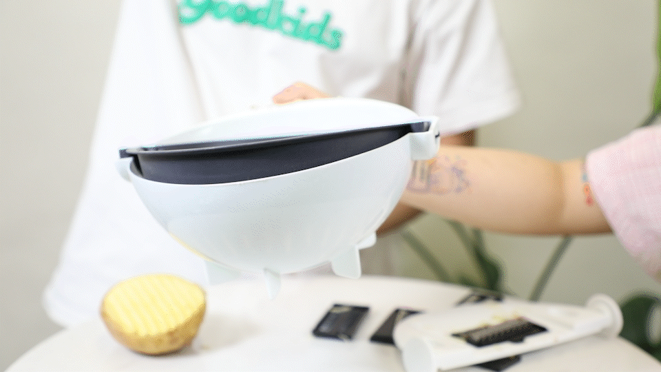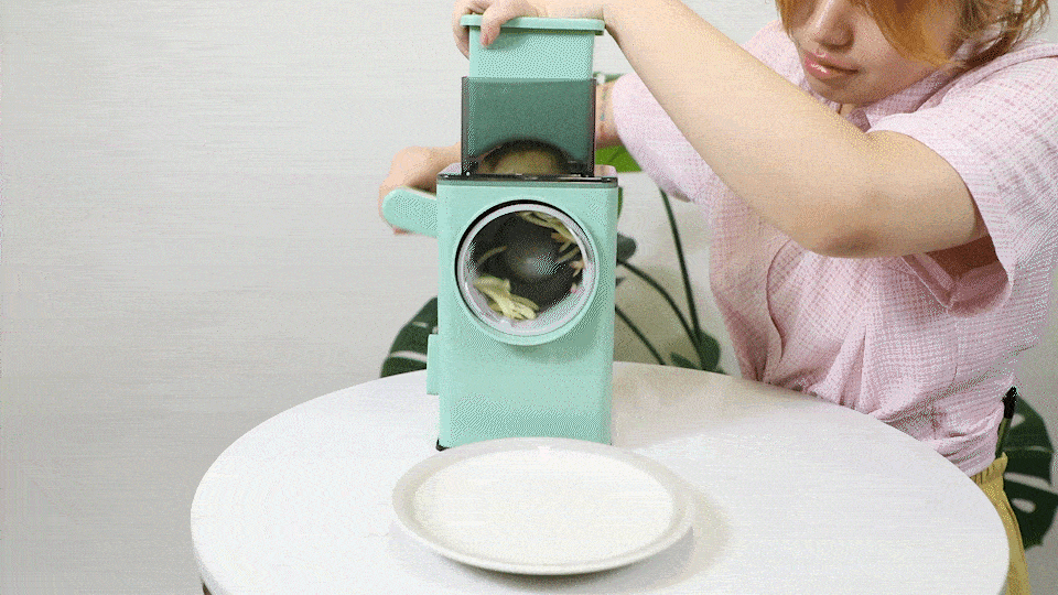 这款厨房切菜沥水神器的工作原理是上边可擦丝,然后落到下方的镂空篮子里,再一旋转就可以去水留丝!整个过程听起来行云流水,一口气省下了菜刀、菜板、洗菜篮三个工具,还能自动排水,属于是懒人之光。