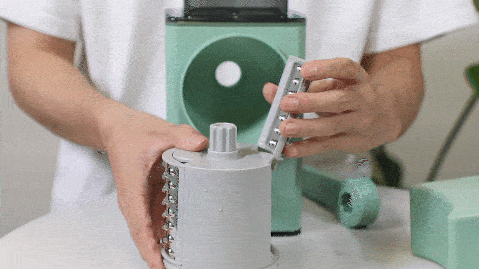 分别用来切丝、切细丝、切片。切换安装只需要把卷动部分拆卸下来换一下就行,但是还是要提醒友友们注意保护,不要在换刀片的时候划伤手。