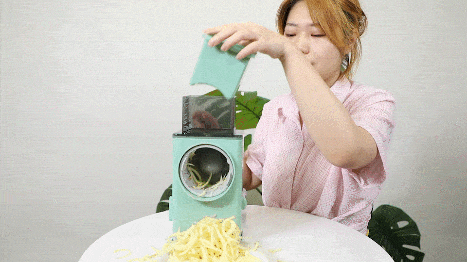操作十分方便,只要把土豆扔进去,转动把手就能迅速肢解土豆!我计算了一下,切一个土豆只需要30秒。这就相当于一个大号的卷菜刀,整个暴风吸入。