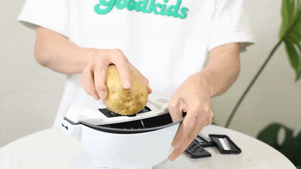 暴风切菜神器就完美改善了上一款容易切到手,放不稳的缺点,它下边按钮一摁就能让稳稳吸在台面上,上边的压菜部分也可以很好地保护手手!