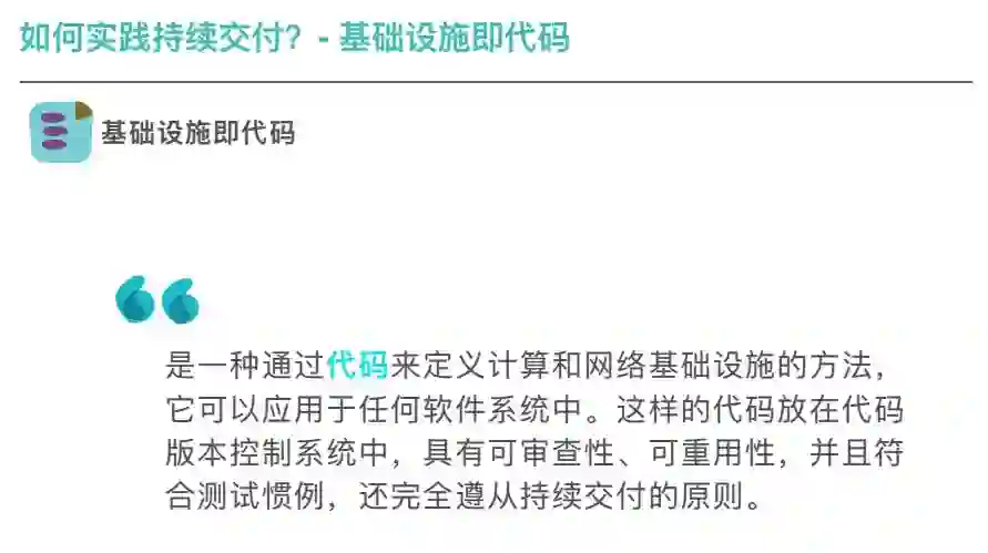 基础设施即代码,通过代码来定义计算机和网络基础设施的方法,可以应用于任何软件系统中,这样的代码的好处是可审查、可重用而且符合测试管理,完全遵从持续交付的原则。