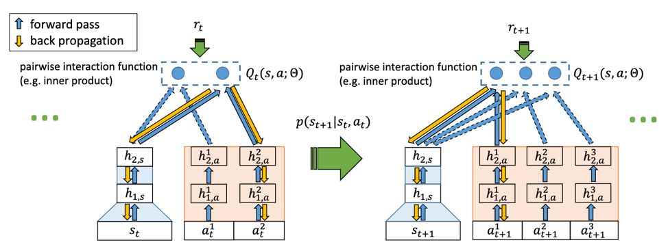 对此,我们需要考虑的是,如何设计更好的对话策略网络,使得系统能够快速的扩展新的动作。首先的尝试来自微软 [21],他们试图通过改变经典的 DQN 结构来实现系统在不受限动作空间上的增强学习。