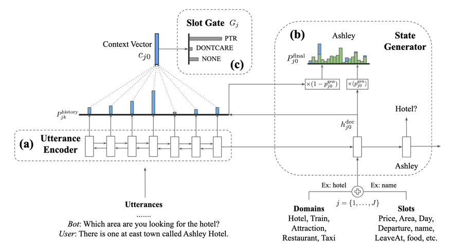 在著名的多领域对话 MultiWOZ 数据集上,来自港科大的 Pascale Fung 教授团队利用了拷贝网络,显著提高了不可枚举槽的识别精度 [20]。他们提出的 TRADE 模型如图 6 所示,每次检测槽值时,模型会将领域和槽位的不同结合进行语义编码作为 RNN 解码器的初始位置输入,解码器通过拷贝网络,直接将对应的槽值生成出来。