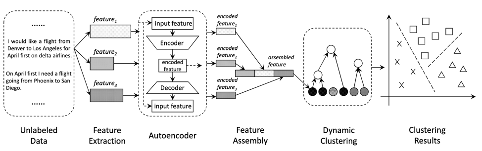 该方法是基于一个假设:相同意图的表达可能会共享相似的背景特征。模型提取的初始特征包括词向量、POS 标注、名词词簇和 LDA 四种特征。各个特征经由自编码器转成相同维度的向量后进行拼接,再采用 RBF(radial bias function)函数计算类间距离进行动态的层次聚类。距离最近的类将会自动合并,直到类间距离大于预设的阈值停止。模型框架如图 10 所示。