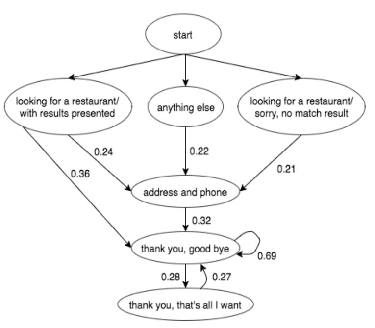 论文实验表明 VRNN 要优于传统的 HMM 的方法,同时将对话结构的信息加入到奖励函数中,也有助于增强学习模型更快地收敛。图 12 是经过 D-VRNN 挖掘出的餐馆领域的隐变量转移概率的可视化图。