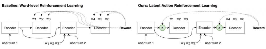 作者提出的隐动作模型和基线模型的区别是 encoder 到 decoder 之间多了离散隐变量的后验推理,对话动作由离散隐变量表示,没有任何人为的干预定义。最终实验证明,基于隐动作的端到端增强学习模型在语句生成的多样性和任务完成率上均超过了基线模型。