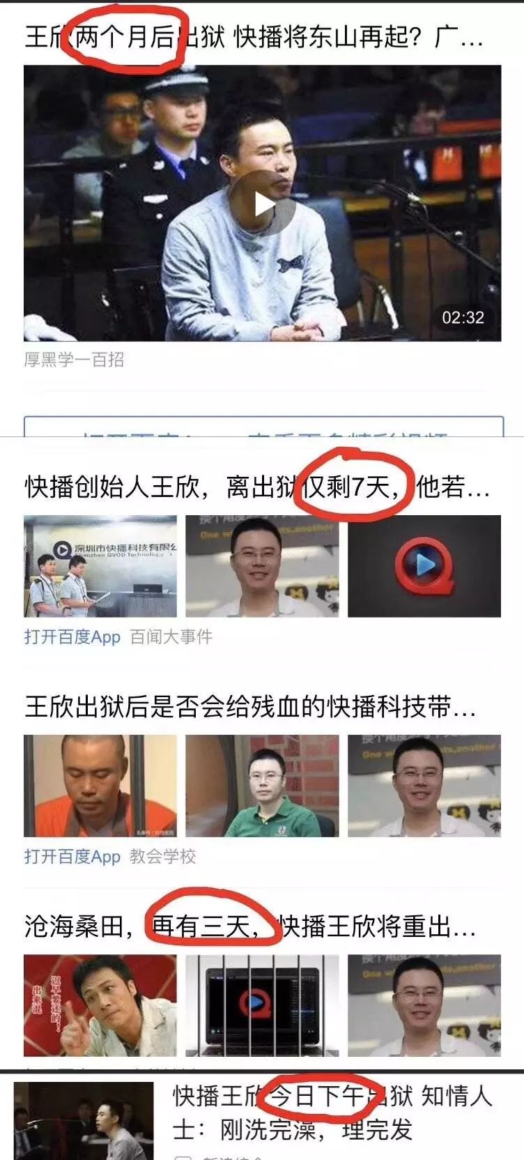 2018年2月7日,创业家从知情人士处得到消息,称快播创始人王欣当天下午刚刚出狱,“刚洗完澡,理完发”。