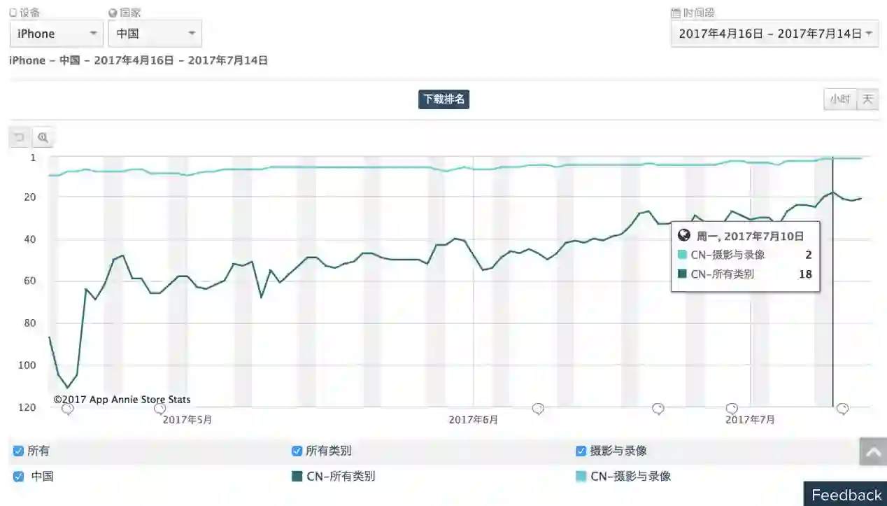 抖音,于2016年9月上线,其定位同样是“专注年轻人的15秒音乐短视频社区”,根据AppAnnie的数据显示,抖音最近三个月的APP Store下载排名都呈现了迂回上升的势头,最近一周更是跻身中国APP Store榜单摄影与录像类第2名,全榜18名。