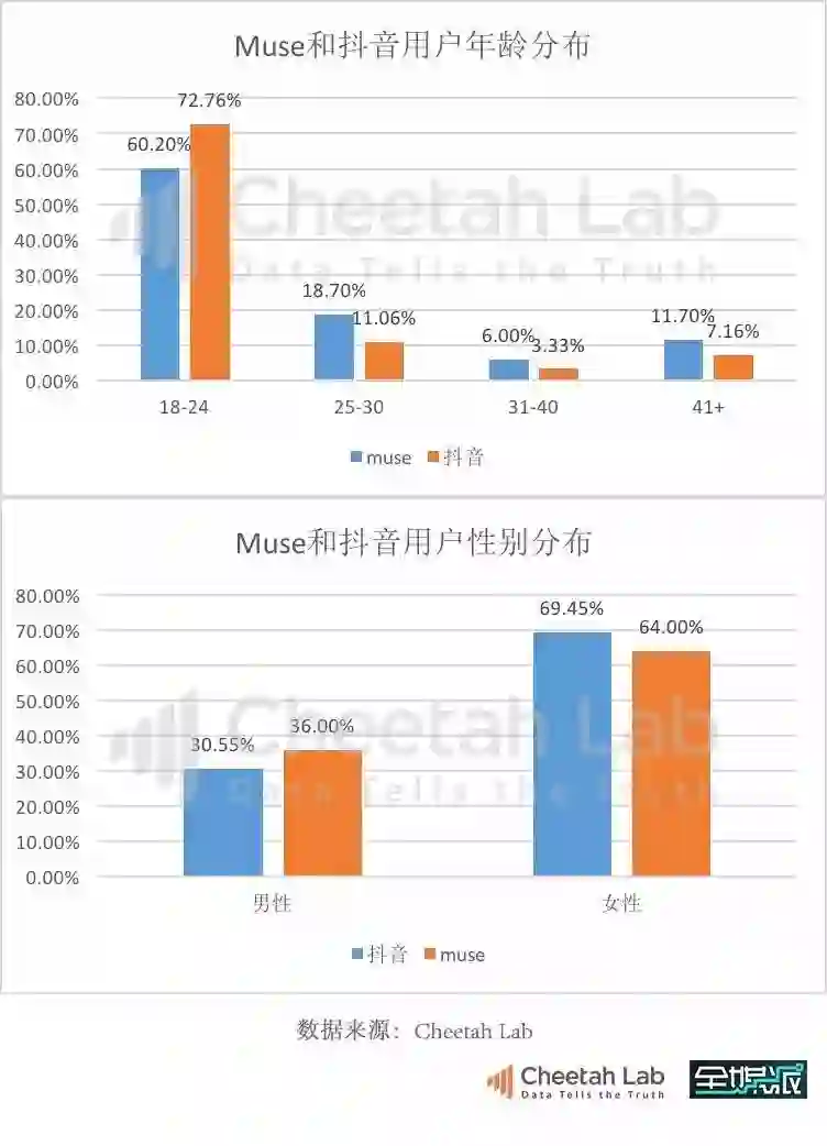 两款APP的使用者中,年龄位于18-24岁这个阶段的用户,抖音比muse多12.5%,25-30岁的用户muse比抖音高出7.7%,30岁以上的用户也是muse占比略高。而在性别分布上,使用抖音的女性用户更多,占到了近70%,这个比例在muse是64%。