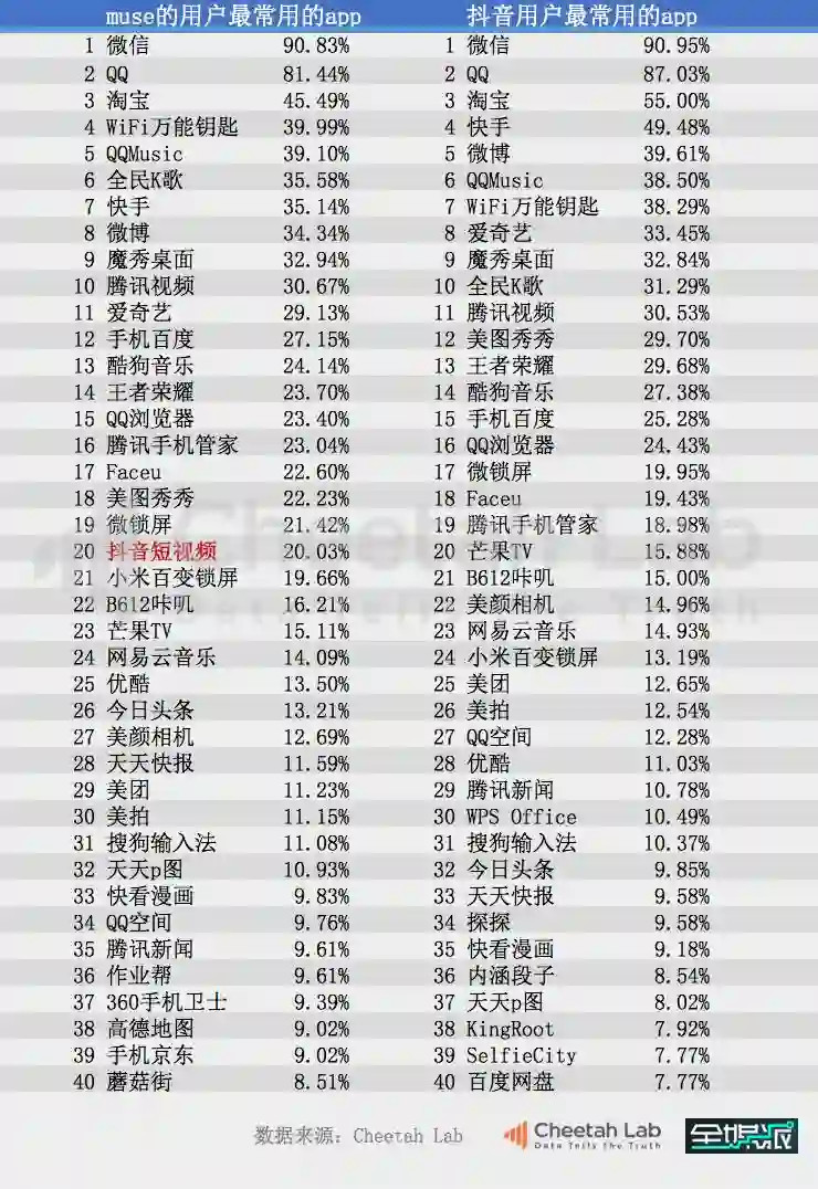 猎豹全球智库(Cheetah Lab)的数据将抖音和Muse用户重合的APP进行了比较,其中,有几个比较有趣的数据特征: