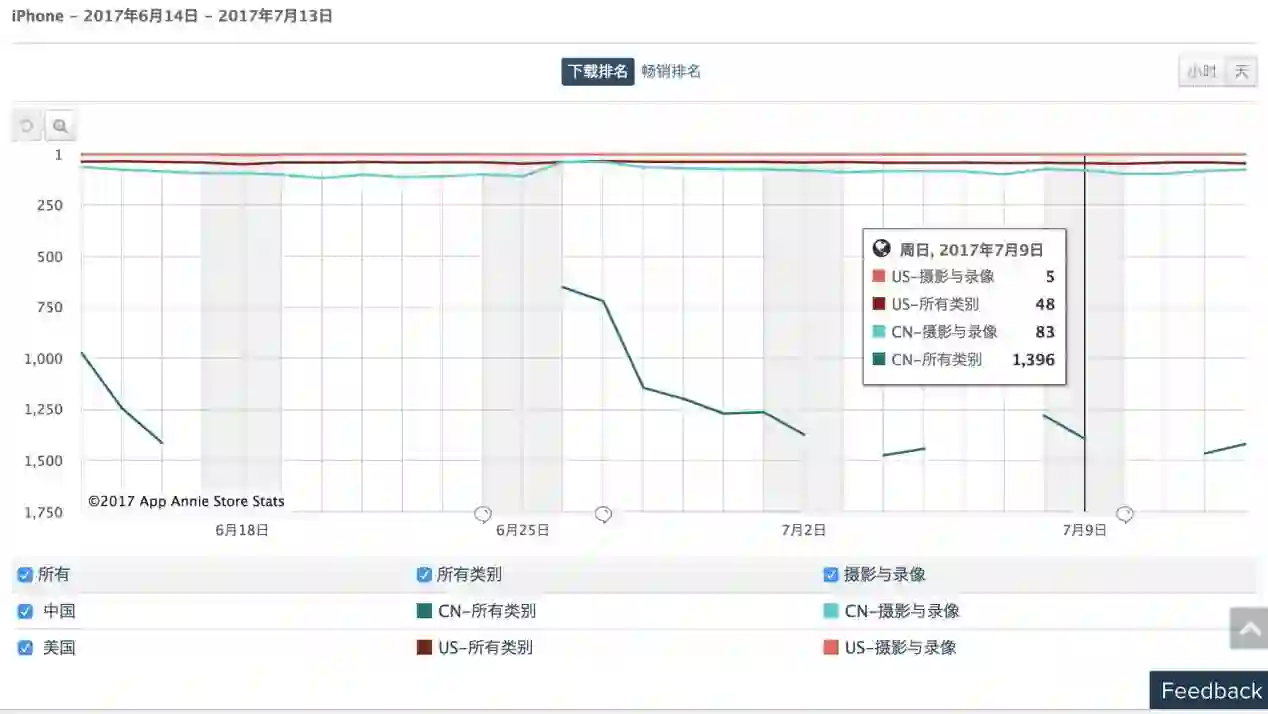 若是抛开竞品进行自身的纵向比较,musical.ly在中国的战绩也尚不能和美国市场比肩。以AppAnnie上2017年7月9日的数据为例,在美国和中国App Store排行榜上,musical.ly在摄影与录像类中的排名分别是第5名和第83名,在全部类别中的排名分别是48名和1396名。